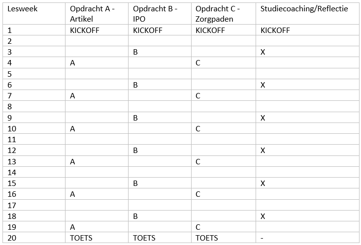 Je zult om de week les krijgen van twee leeruitkomsten. Elke leeruitkomst levert je 10 studiepunten (ECT) op. 10 studiepunten staat gelijk aan 280 uur, deze uren zijn opgebouwd uit 20 contacturen en 260 zelfstudieuren. Een concept van de indeling zou dus als volgt kunnen zijn: